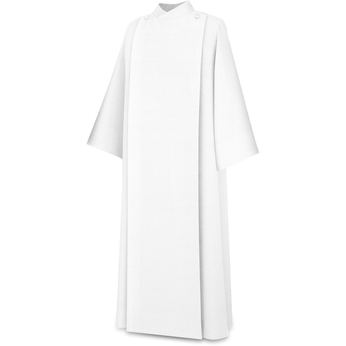- The alb has a convenient coat style, a collar finished with a fixed amice, concealing clothing underneath, with fabric covered buttons for perfect fit.