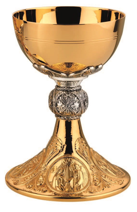 Hammered cup and base over floral motifs. Deep relief medallions on base depicting the Annunciation, Last Supper, Crucifixion and Resurrection.