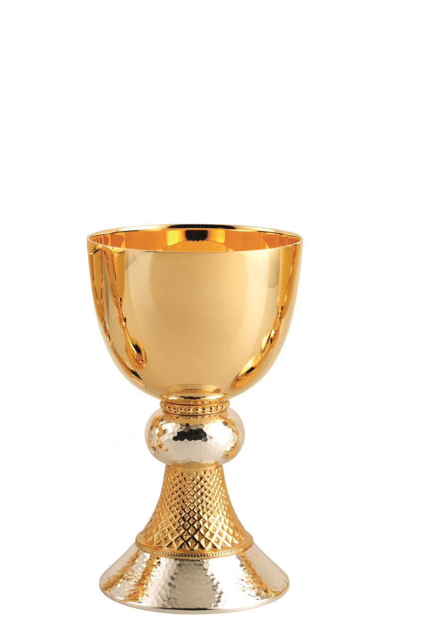 This fully hand made chalice features a chiseled base and hammered node. The Two-Tone design is available in multiple finishes.