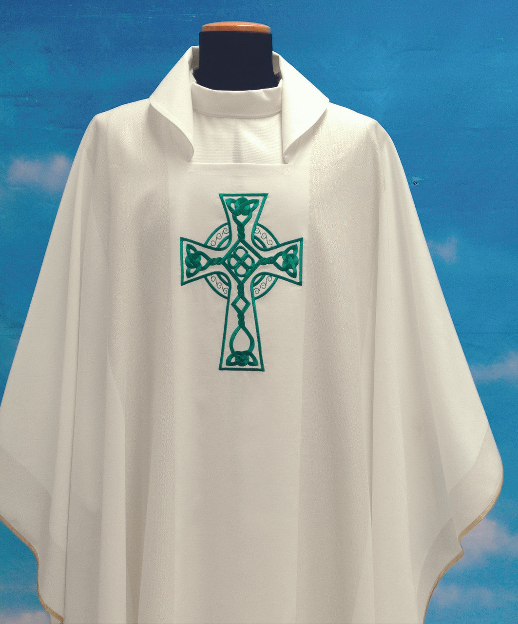#348 Celtic Cross Chasuble | Square Collar | Mixed Wool | Green & White