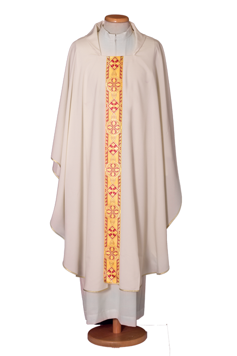 100% polyester, simple and functional. Features a square collar and chevron sewn directly onto the mantle, ensuring a basic but neat design. Ideal for practical and curated liturgical celebrations.