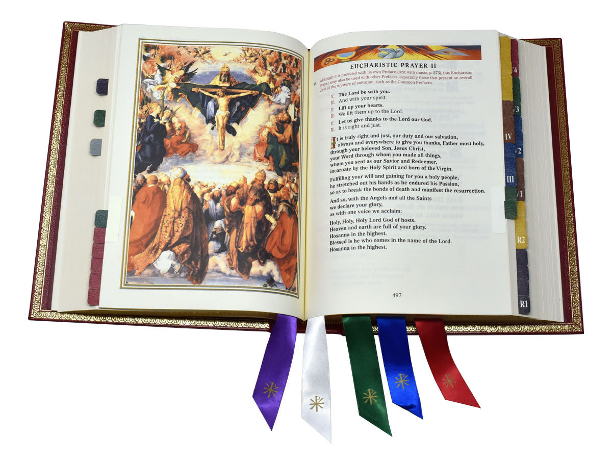 From the leader in Ritual publishing comes this most elegant altar edition of The Roman Missal. Its large, bold, easy-to-read type for Priest's text and music; doubly reinforced Smyth-sewn binding carefully crafted to ensure the highest standards; durable 80-lb. paper; sturdy, functional tabs for the Order of the Mass; gold-stamped and reinforced endsheets; and gold-embossed foil stamping on front cover and spine combine to enhance the beauty and durability of this treasured edition. Five satin ribbon markers add a distinctive finishing touch. Over 300 full-color illustrations throughout.