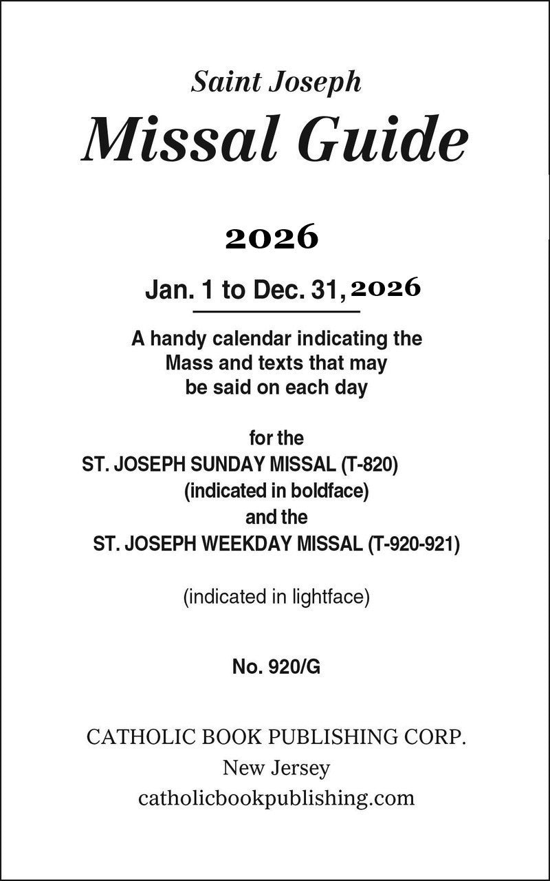 A handy calendar that indicates the Mass and texts that may be said on each day. Can be used with the following ST. JOSEPH SUNDAY MISSALS: Product Codes 820/09; 820/22GN; 820/22B; 820/10BN; and 820/23 and the following ST. JOSEPH WEEKDAY MISSALS: Product Codes 920/09; 920/23; 921/09; and 921/23.