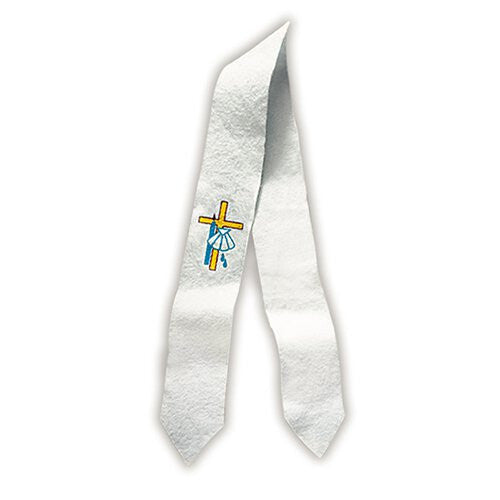 Holy Baptism is the first of seven sacraments and the way in which a person becomes a member of the Catholic Church. This child's silk screened felt stole is an essential part of a Baptism and traditionally worn when receiving the sacrament. Bib contains a full-color cross, candle, shell and water image. Each garment comes individually bagged.