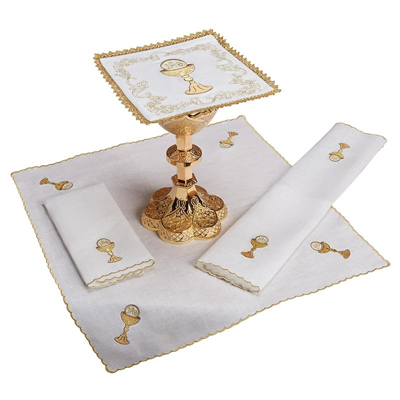 Exclusive design from R. J. Toomey™, Chalice & Host Altar Linen Gift Set is handcrafted from 100% linen with golden embroidery and lace trimmed.