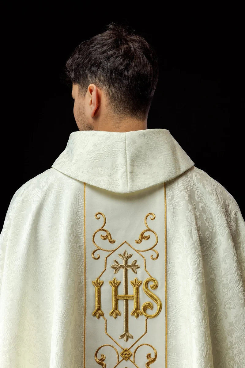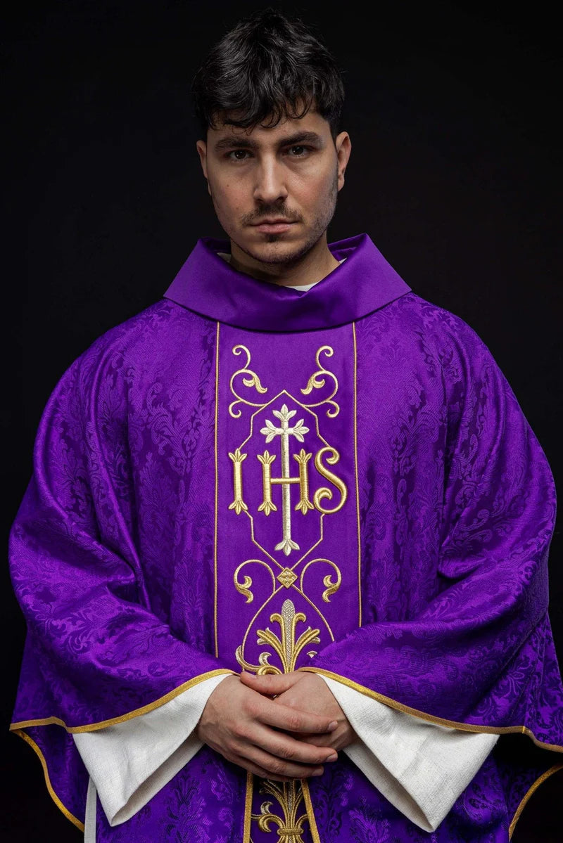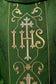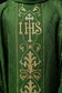 This IHS Chasuble features ornate embroidery on a high quality fabric, finished with a gold-satin trim.