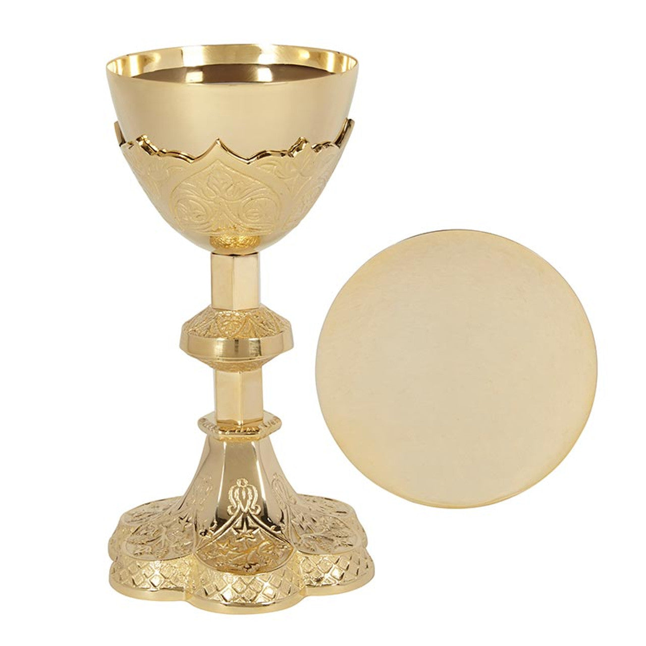 #NS712 - Vine Embossed Chalice & Paten; Brass, Gold Plate; 12 oz.; 4 1/2" Diameter x 9 3/4"H; 5 1/2" Diameter Paten