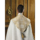 Here we have a processional cope woven in a stunning Jacquard fabric. Beautifully done at a great value. Made in the classic semi-circular style and trimmed with a gold jacquard orphrey and collar. The gold toned clasp closure may be hooked anywhere on the chain.